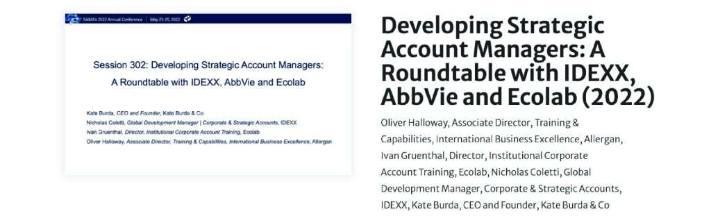This roundtable is an opportunity for talent management professionals, SAM program executives, and SAM managers to exchange best practices and discuss issues as well as challenges related to establishing the strategic account manager position as a recognized career path. Panelists from IDEXX, AbbVie, and Ecolab will share best practices and insights on SAM development topics, including SAM certification, critical SAM competencies and skills, career pathing, and the importance of SAM-specific training.