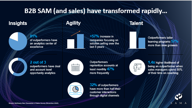 Over the past 12 months, SAMA has established a knowledgeable point of view based on hundreds of webinars, the SAMA Experts Council and countless interviews with members. From all this, we stress tested long-held views about strategic account management. We acquired real-time, relevant insight from the world’s best practitioners and thought leaders in the SAMA community.